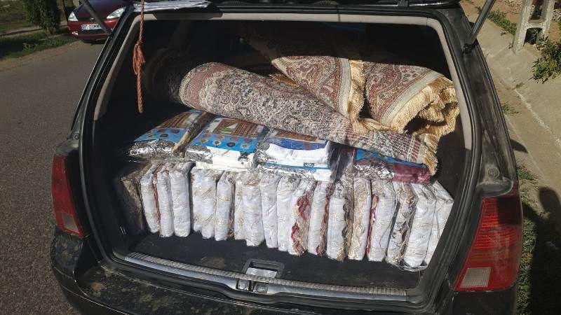 În urma controlului efectuat în interiorul celor două autoturisme, au fost identificate mai multe articole vestimentare destinate copiilor, perdele şi covoare pe care aceştia le comercializau, fără a deţine documente legale.