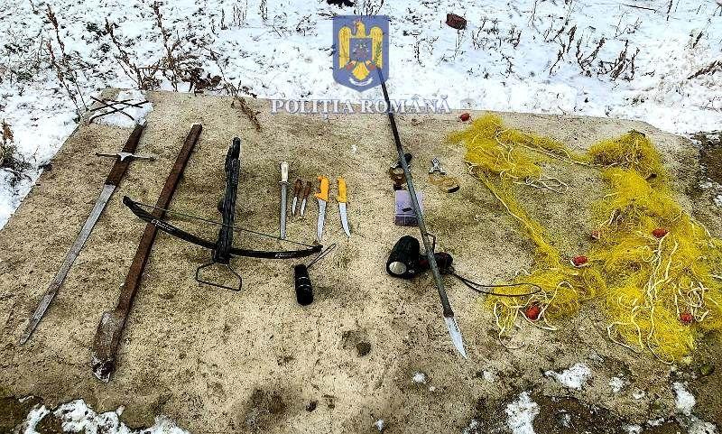 În urma activităților desfășurate la locațiile vizate au fost identificate și ridicate mai multe bunuri care prezintă interes în cauză, printre care sulițe, arbalete, săgeți, lațuri, dispozitive se detectare a metalelor, produse pirotehnice și două autovehicule.