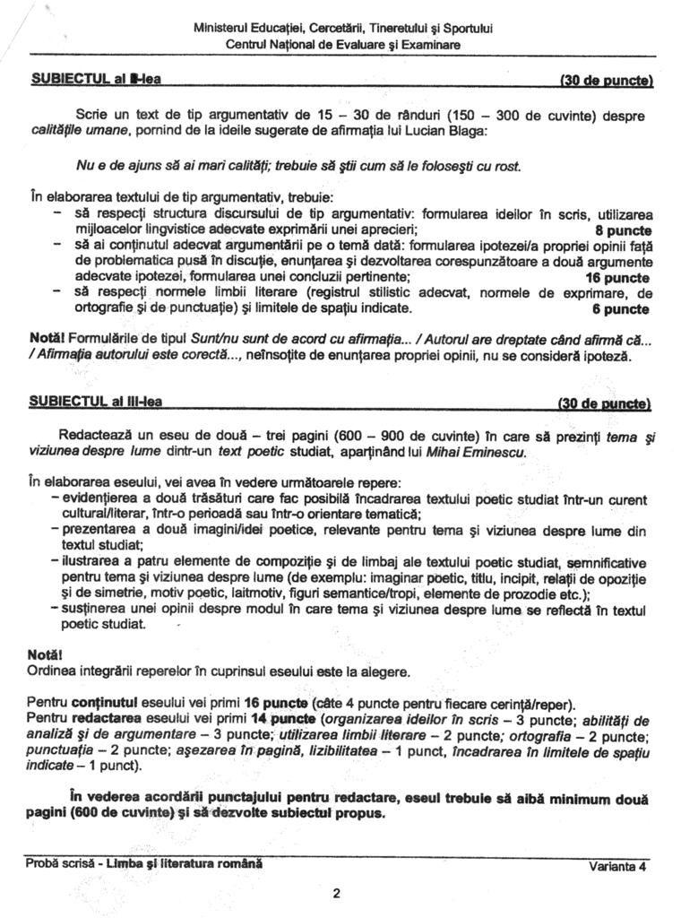 La subiectul I, elevii trebuie să rezolve 10 cerinţe pe baza  textului „Craii de Curtea Veche” a lui Mateiu Caragiale, la subiectul al II-lea aceştia trebuie să scrie un text argumentativ despre calităţile umane, pornind de la o afirmaţie a lui Lucian Blaga. La subiectul al III-lea , elevii au de redactat un eseu de două-trei pagini în care să prezinte tema şi viziunea despre lume dintr-un text poetic studiat aparţinând lui Mihai Eminescu. (Mădălina O.)