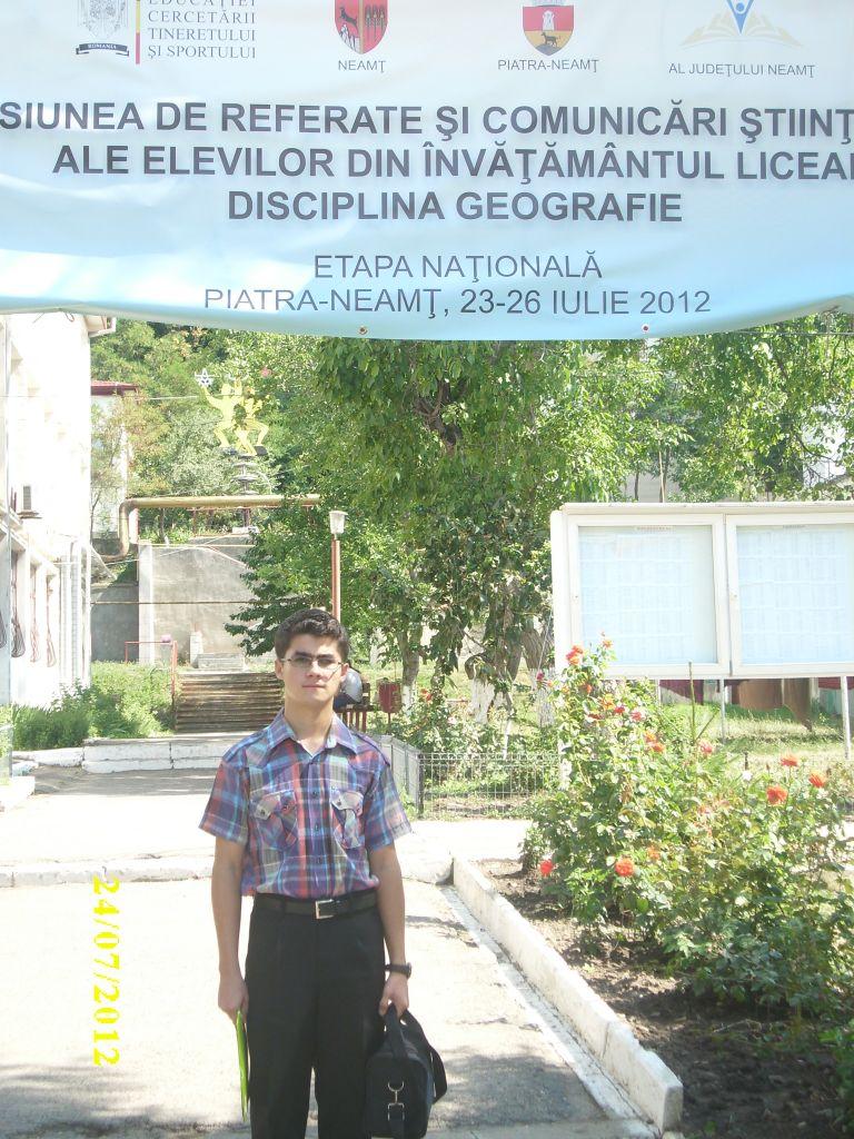 În perioada 22 – 26 iulie 2012, la Piatra Neamţ s-a desfăşurat etapa naţională a Sesiunii de Referate şi Comunicări Ştiinţifice ale elevilor de liceu, la disciplina geografie. La concurs au participat câte trei elevi din toate judeţele, inclusiv sectoarele capitalei, fiecare concurând la câte una din cele trei secţiuni ale concursului: geografie fizică, geografie umană şi geografia mediului.