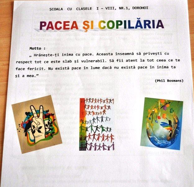 Ne dorim din tot sufletul să fie o săptămână frumoasă, cu activităţi reuşite ,prin care să arătăm că şi noi avem datoria şi onoarea de a veghea pacea lumii, de a ocroti copilăria, de a creea punţi indestructibile, durate pentru veşnicie între pace şi copilărie, coordonator, înv. Liliiana Crăciun,coordonator educativ la Şcoala cu clasele I-VIII,nr.1, Dorohoi. (DorohoiNews.ro)