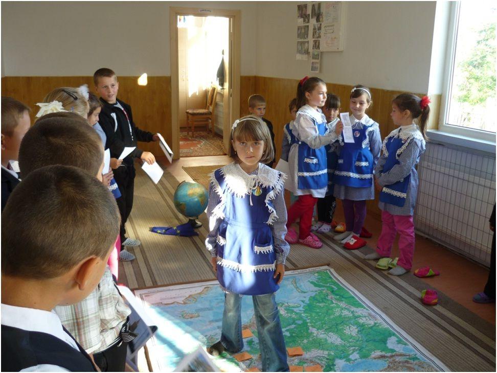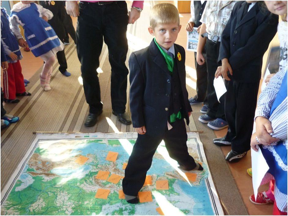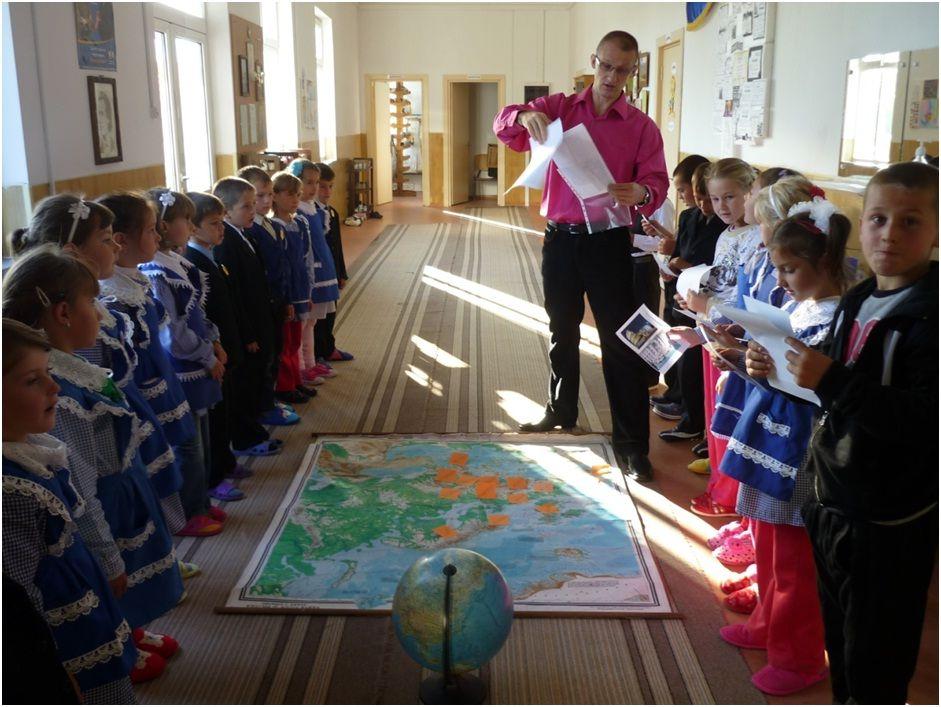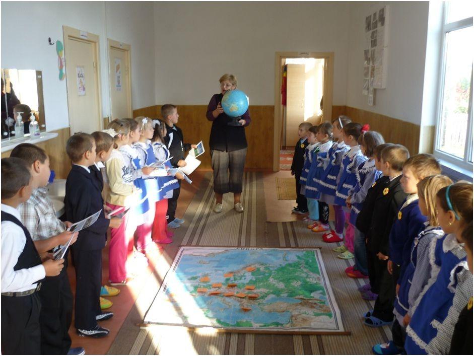 Ne-am propus, respectând particularităţile de vârstă, să facem o călătorie imaginară prin Europa. D-na înv. Rudei Lucia a localizat pe glob Europa ca si continent, apoi pe harta Europei au fost localizate ţările cu ajutorul postit-urilor. Astfel, şcolarii clasei I „păşeau ”dintr-o ţară europeană în alta salutând în limba ţării „vizitate”. Elevii clasei a II a, îndrumaţi de d-l prof. înv. primar Dănilă Mirel, prezentau imagini reprezentative din respectivele ţări. La sfârşitul „călătoriei” toate materialele au fost ordonate într-o expoziţie pe holul şcolii.