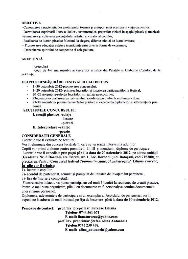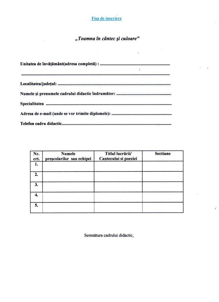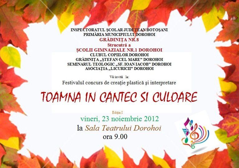 Festivalul concurs „Toamna în cântec şi culoare” urmareşte încurajarea preşcolarilor in exprimarea unor sentimente de dragoste faţă de natură şi dezvoltarea simţului estetic prin familiarizarea acestora cu creaţiile literare dedicate acestui anotimp si transformările care au loc în mediul înconjurător.