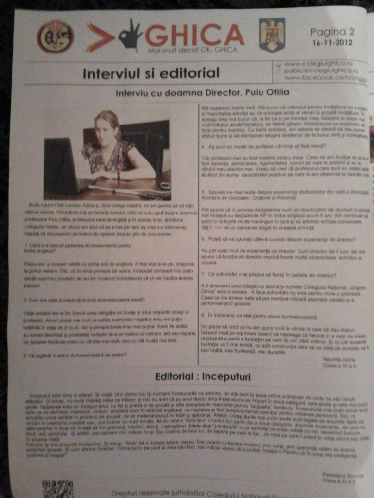 -”>OK Ghica”, lansare ziar, broșură, film prezentare colegiu, au participat clasele aXI-a A, a-XI-a E, a-XII-a F, coordonator: Prof. Cucoreanu Gretti