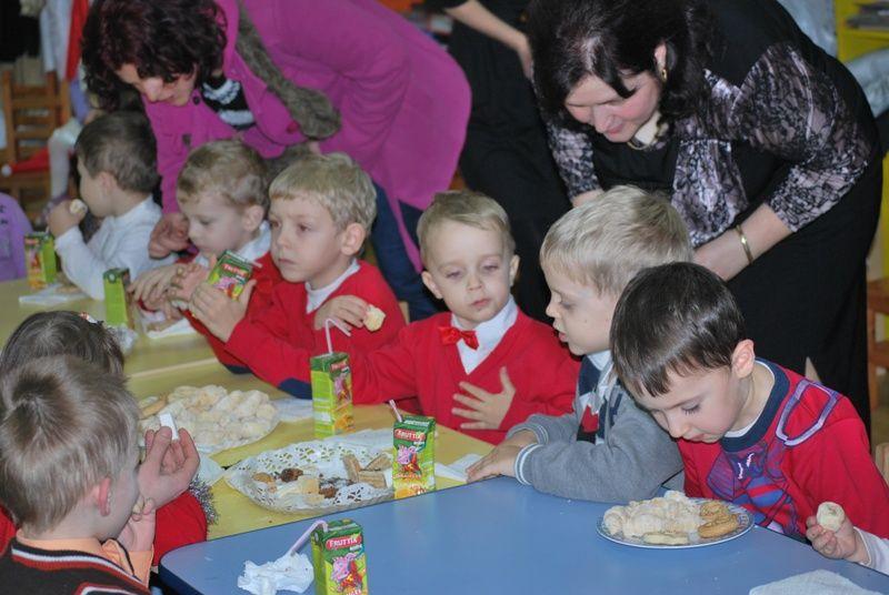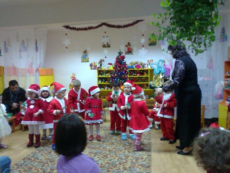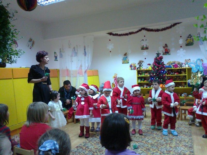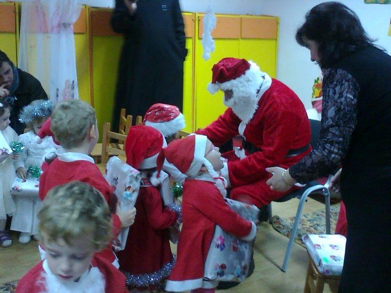 Şi moşul a venit... încărcat cu daruri, vesel şi prietenos. O fetiţă mai îndrăzneaţă l-a luat de mână şi l-a condus la scăunelul de lângă brad. Moşul a stat răbdător, a ascultat colinde, poezii, cântece şi s-a bucurat împreună cu copiii. La final a împărţit darurile.