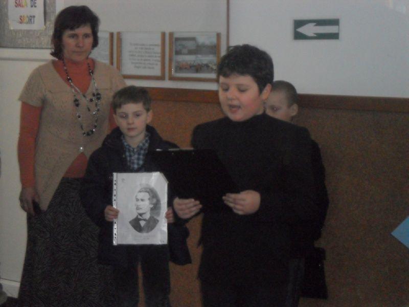 Grupul de recitatori „Flori şi stele” al clasei a II a, îndrumat de d-l profesor Drescanu Corneliu a adus muzicalitatea şi emoţia versurilor eminesciene în sala de spectacol a şcolii, recitând „La mijloc de codru”, „Luceafărul”, „Ce-ţi doresc eu ţie, dulce Românie”, perle ale creaţiei poetului evocat.
