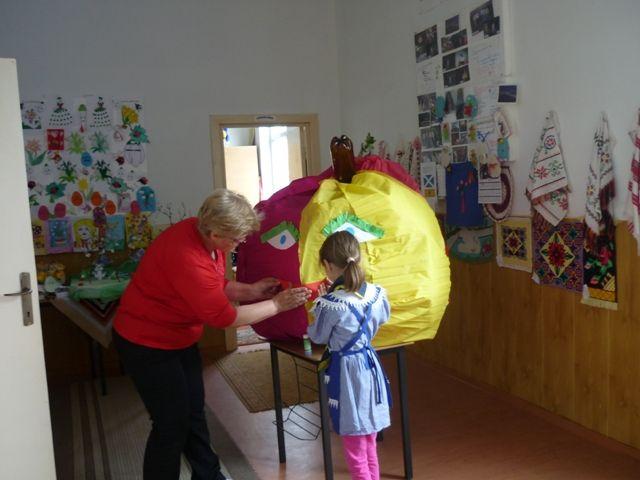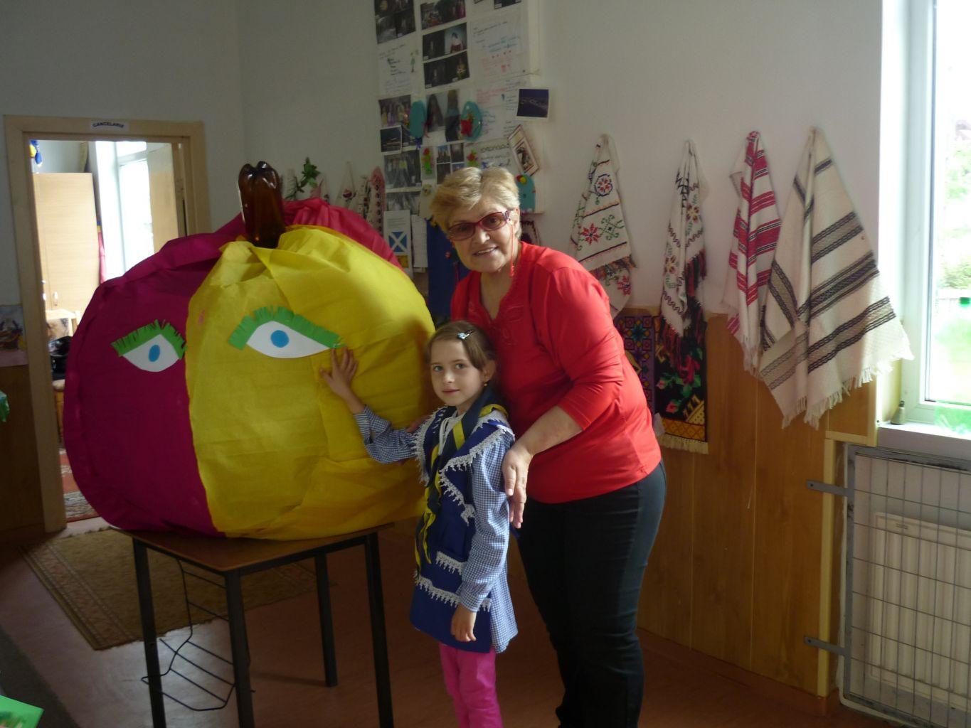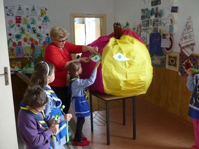 Pentru că sunt încă mici copiii au chemat în ajutor pe tata pentru a-i ajuta să construiască scheletul din sârmă. Apoi au adunat cartoane cu care au umplut scheletul. Dintr-un pet au pus codiţa şi frunzele din resturile unei flori de plastic. Şi pentru că mărul trebuia să participe la un concurs, elevii l-au îmbrăcat în straie de sărbătoare folosind hârtie creponată. Apoi au personificat mărul dându-i chip vesel. La această acţiune s-au implicat ghizii unităţii Narcisa elevi ai claselor I şi a III a coordonaţi de d-na. înv. Rudei Lucia şi elevii clasei a II a coordonaţi de d-l. prof. înv. primar Dănilă Mirel. Atmosfera de lucru a fost veselă şi ne-a inspirat să compunem versurile: