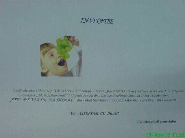 Având ca motto „Sănătatea e comoara cea mai preţioasă şi cea mai uşor de pierdut; totuşi cel mai prost păzită. ”(Emile Augier), evenimentul organizat marţi, 19 noiembrie 2013, la Liceul Tehnologic Special „Ion Pillat”, a reuşit să marcheze, într-o manieră complexă, axată pe interdisciplinaritate, „Săptămâna Educaţiei Globale”.