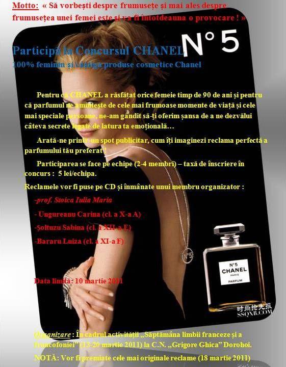 Acesta poartă numele de Chanel no 5 şi este organizat cu prilejul împlinirii a 90 de ani de la apariţia parfumului. Se pot înscrie până pe 10 martie 2011 echipe de câte 3 sau 4 elevi de liceu, cu o taxă de participare de 5 lei pe echipă. „Se va aprecia creativitatea şi originalitatea cu care elevii abordează această temă. Spoturile pot fi făcute pentru orice parfum, cu o durată de aproximativ 30-50 de secunde. Aşteptăm să se înscrie cât mai mulţi elevi, deoarece premiile vor consta în produse Chanel,” a spus profesorul coordonator al acestei acţiuni, Iulia Maria Stoica. Pe lângă cele trei premii, va exista şi un premiu de popularitate, unde elevii colegiului vor hotărî care spot publicitar este mai original.