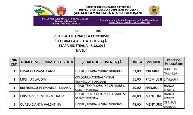 Seria rezultatelor de excepție a fost deschisă anul acesta de Olimpiada de lingvistică și Olimpiada Lectura ca abilitate de viață, etapa județeană încoronând elevii liceului cu 2 premii I, 1 premiu III și două mențiuni. Grație acestor rezultate, elevele Ioana-Maria Calancea, clasa a IX-a D și Eva-Ștefania Ursachi, clasa a XII-a D, vor reprezenta județul Botoșani la etapa națională, după ce au obținut 55, respectiv 53 de puncte, din 60 posibile, la etapa județeană a Olimpiadei Lectura ca abilitate de viață, desfășurată sâmbătă, 7 decembrie 2013, la Școala 13 Botoșani. Coordonate de d-na prof. Gabriela Bolohan, cele două eleve au avut parte de o concurență serioasă, dar au demonstrat că sunt cele mai bune la nivelul lor. În același concurs Bianca Gurzu, clasa a XI-a E (prof. Daniela Doina Oprișan) a obținut mențiune.