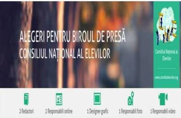 În perioada 24 februarie-6 martie 2014, Consiliul Național al Elevilor desfășoară alegeri pentru constituirea unui nou Birou de Presă. Structura acestui departament, aflat sub coordonarea Secretariatului de Educație și Comunicare (Relații Externe), presupune: