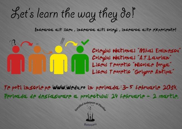 „Let’s learn the way they do!” este un proiect ce include schimbul de experiență între tineri, la nivel municipal, adresat elevilor de clasa a IX-a și a X-a. În perioada 5-7 februarie, elevii și-au depus aplicațiile pe platforma Consiliului Național al Elevilor, www.wedu.ro, iar în urma analizei candidaturilor au fost aleși 18 elevi, din 48 de aplicanți de la cele 4 instituții școlare partenere. Lista elevilor selectați este disponibilă pe același site. Pe durata acestei săptămâni, elevii selectați vor lua parte la orele de curs în liceele în care au fost repartizați.