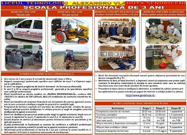 Liceul Tehnologic Alexandru Vlahuţă Şendriceni organizează începând cu anul şcolar 2014-2015 cursuri de şcoală profesională cu durata de 3 ani pentru absolvenții de clasa a-VIII-a.