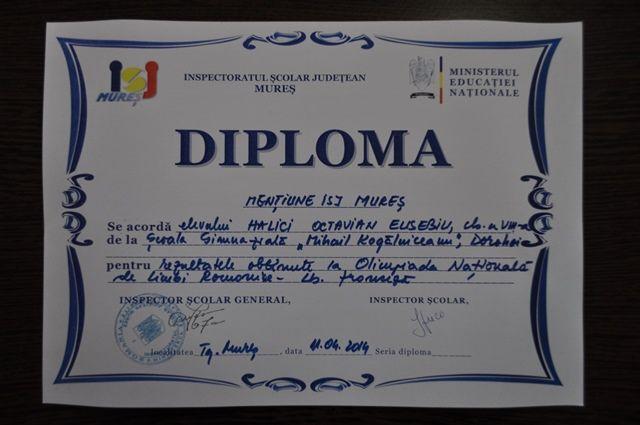 Olimpiada Națională de Limbi Romanice – Limba Franceză a avut loc la Târgu-Mureș, în intervalul 7-11 aprilie 2014. Coordonat de către prof. Sandu Mirela-Cristina, elevul Halici Octavian-Eusebiu, din clasa a VIII-a B, a obținut mențiune.