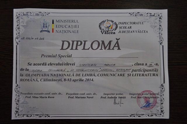Etapa națională a Olimpiadei de Limbă, Comunicare și Literatură română a avut loc la Călimănești, județul Vâlcea, în perioada 9-11 aprilie 2014. Coordonată de către prof. Bordianu Cristina, eleva Streteanu Bianca, din clasa a VIII-a A, a obținut Premiul special, în timp ce elevul Pînzariu Onisim, din clasa a VI-a B, coordonat de către prof. Antonescu Cătălina, a obținut 105 puncte, clasificându-se, ca punctaj, pe locul 19 din 48 de participanți.