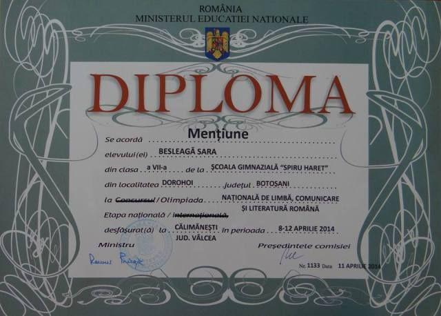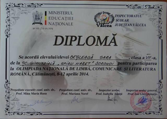 „Dragostea pentru Cuvânt mi-au insuflat-o dascălii, doamna învățătoare Doina Cozma și doamna profesoară de limba română Stela Constantin, cărora le mulțumesc din suflet pentru că au descoperit în mine „mugurele” de talent și, cu dragoste, răbdare și pasiune, l-au ajutat să înflorească, întâi timid, apoi mai îndrăzneț. Munca dascălilor mei merita să fie răsplătită cu un rezultat frumos. Nu ar fi fost posibil să ajung aici fără sprijinul părinților, fără îndrumarea profesorilor și fără încurajările tuturor celor care mi-au susținut pașii timizi și nesiguri... Pentru mine, participarea la Olimpiada Națională de Limbă, Comunicare și Literatură Română a fost o provocare, mai ales că a fost pentru prima dată când am participat la faza națională. Perseverența, ambiția, multă muncă și dorința de a mă afirma m-au determinat să trec peste orice obstacol și emoție. Mi-am dorit să obțin un rezultat frumos pentru școală, oraș și județ.”, a declarat Sara Besleaga, clasa a VII-a A Scoala Gimnaziala „Spiru Haret” Dorohoi.