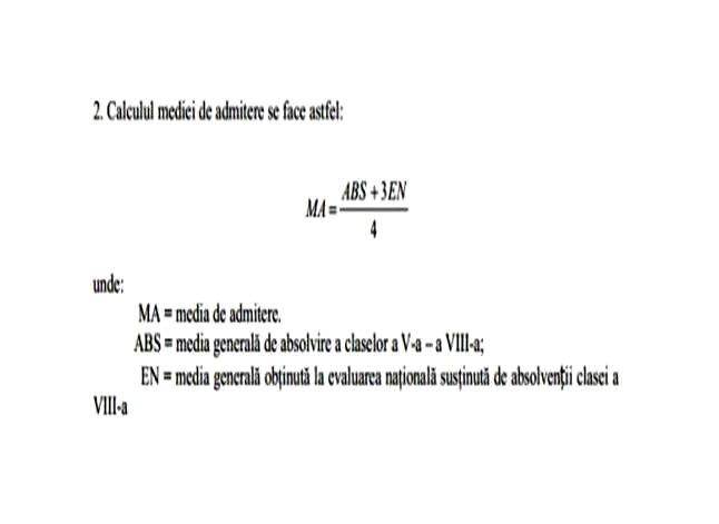 Media de admitere, pe baza căreia se realizează înscrierea în clasa a IX-a a absolvenților învățământului gimnazial, se calculează ca medie ponderată între media generală la evaluarea națională susținută de absolvenții clasei a VIII-a, care are o pondere de 75%, şi media generală de absolvire a claselor a V-a – a VIII-a, care are o pondere de 25% în calculul mediei de admitere.