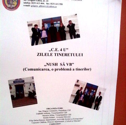Consiliul Judeţean al Elevilor Botoşani în parteneriat cu Direcţia Judeţeană pentru Sport şi Tineret Botoşani și Inspectoratul Şcolar al judeţului Botoşani a organizat în cadrul proiectului ZILELE TINERETULUI, finanțat de Ministerul Tineretului și Sportului concursul “C.E. 4 U”, un concurs de proiecte pe tema “2 MAI-ZIUA NAȚIONALĂ A TINERETULUI” la care a participat şi Consiliul Şcolar al Elevilor de la Colegiul Naţional „Grigore Ghica” Dorohoi.
