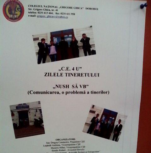 Proiectu „NUSH SĂ VB”, iniţiat de elevii din Consiliul Şcolar al Colegiului Naţional „Grigore Ghica” Dorohoi, a ajuns la final. Pe parcursul unei săptămâni, s-au desfăşurat activităţi ce au avut drept scop motivarea elevilor de a găsi situaţii diverse în care să descrie aspecte ale comunicării ce le influenţează viaţa de zi cu zi. Acestea activităţi s-au cristalizat sub următoarele titluri: „Cine are dreptate?”, „Cartea – prieten sau duşman”, „ABC-ul comunicării”, „Manual pentru părinţi”.