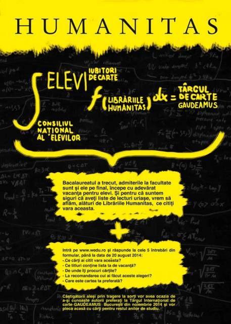 În perioada 24 iulie-20 august, Consiliul Național al Elevilor, în parteneriat cu Librăriile Humanitas, derulează o campanie de susținere şi promovare a lecturii în rândul tinerilor. Campania își propune să aducă tineri din toată țara, pasionați de lectură, la Târgul de Carte Gaudeamus, cel mai mare târg de carte din România. Tinerii vor fi selectați prin tragere la sorți în urma depunerii unei aplicații pe platforma suport a Consiliului Național al Elevilor, Wedu.ro (http://wedu.ro/aplicatii-cne-premiaza-iubitorii-de-carte-2014/lista), în care vor răspunde la o serie de întrebări legate de preferinţele lor în materie de cărţi: cărțile citite până acum, lista de lectură pe care o au pentru această vară, la recomandarea cui obișnuiesc să își achiționeze cărțile și care este cartea lor preferată.