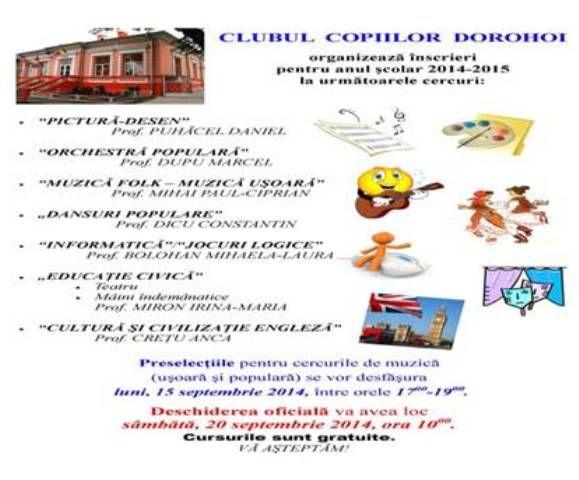 Pe data de 20 septembrie 2014, începând cu orele 10:00, elevii din municipiul Dorohoi şi localităţile alăturate sunt aşteptaţi la Clubul Copiilor Dorohoi pentru a participa la festivitatea de deschidere a anului şcolar 2014-2015.