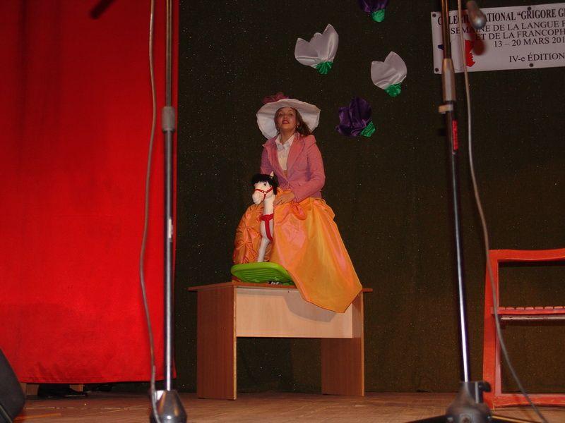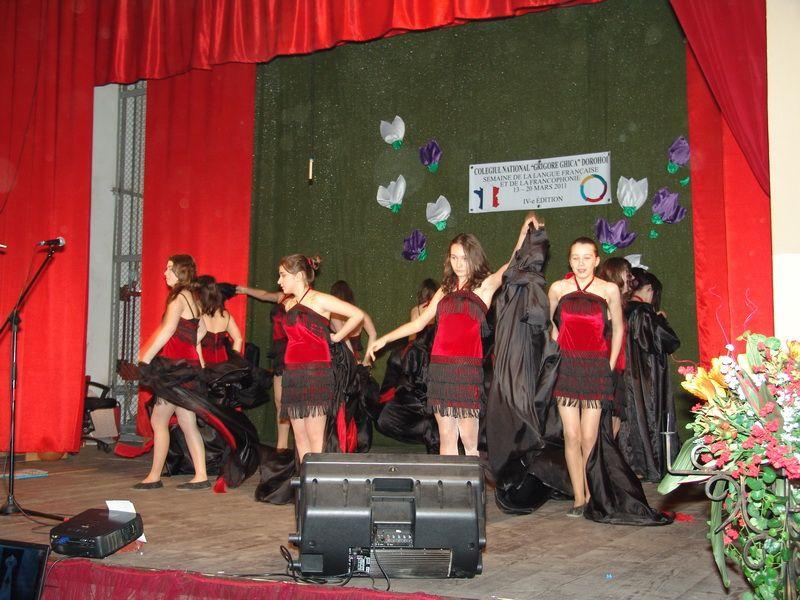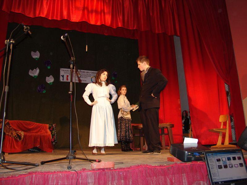 Spectacolul a fost deschis cu o prezentare video în limba franceză, urmată de cântecul Champs-Élysée in interpretarea unui grup de elevi de la Şcoala nr.8. Piesa de teatru “L'Amour médecin”, o comedie scrisă de Molière, interpretată de şase elevi ai clasei a XII-a E, iar trei eleve din clasa a XI-a F au prezentat un dans pe ritmurile muzicii franceze. Un alt grup de elevi de la Şcoala nr. 8 au jucat piesa de teatru “Chiriţa în provincie”, piesă care a zugrăvit dorinţa de parvenire din acele vremuri. Prezentatoarea spectacolului, Ionela Ursea a interpretat piesa “Je sais”,un grup de elevi ai clasei a IX-a F au pus în scenă o piesă de teatru, creaţie proprie,urmată de trupa de dans “Electric Purple”, care activează la Casa Municipală de Cultură.