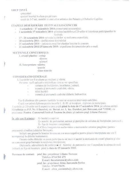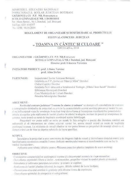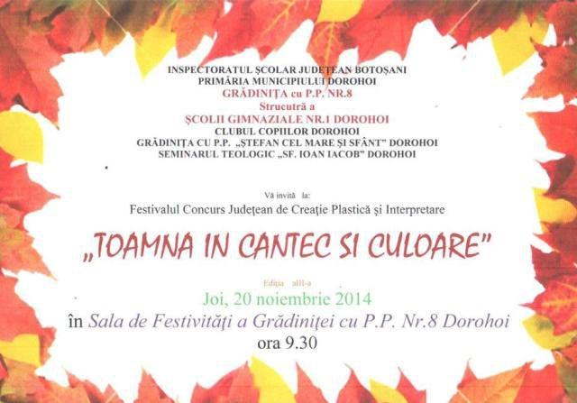 Grădiniţa cu P.P. Nr. 8, structură a Şcolii Gimnaziale Nr.1 Dorohoi are onoarea de a vă invita să participaţi în data de 20 noiembrie, în Sala de festivităţi a unităţii, la cea de-a treia ediţie a Festivalului Concurs Judeţean „Toamna în cântec şi culoare”. Concursul se regăseşte în C.A.E.J. Botoşani la poziţia 35.