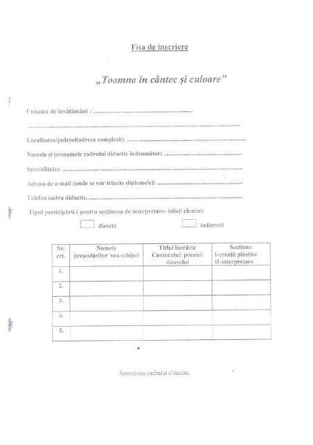 Initiatorii acestui proiect, (prof. Liliana Turceac si prof. Alina Stefan) alaturi de partenerii implicaţi vă aşteaptă cu drag la cea  de-a treia  ediţie a Festivalului Concurs Judeţean „Toamna în cântec şi culoare”.