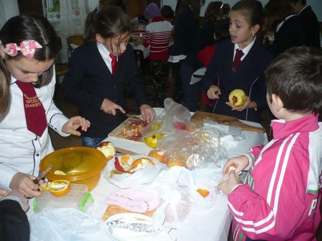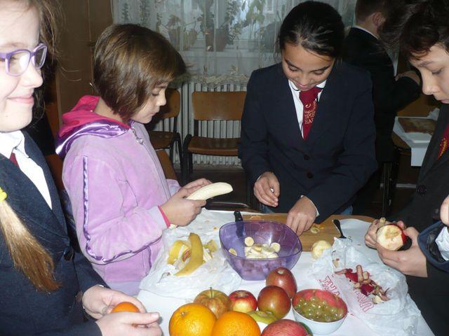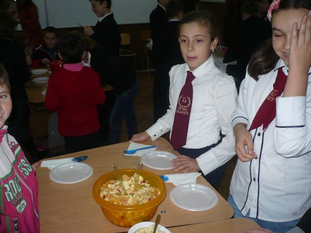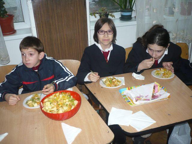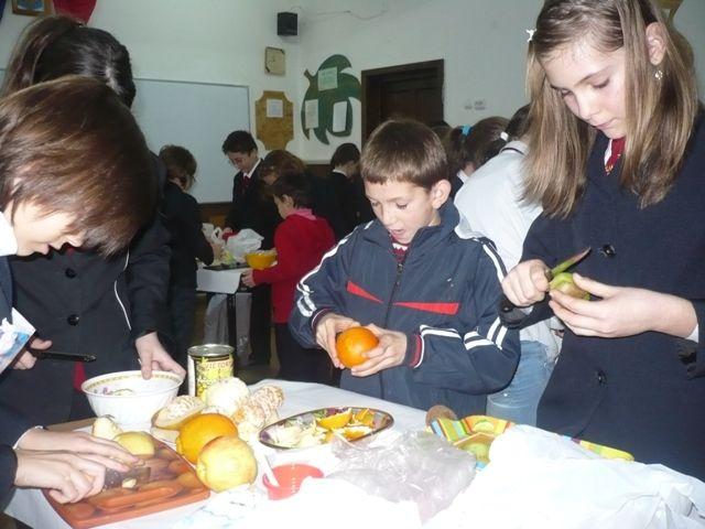 Cei 31 de elevi din clasa a IV-a C, Școala Gimnazială „Spiru Haret” Dorohoi, au fost gazdele perfecte pentru colegii lor mai mici din clasa a II-a, Liceul Tehnologic Special „Ion Pillat” Dorohoi. Ei s-au întrecut mai întâi în cadrul unui concurs de ghicitori, apoi au colaborat, lucrând în echipe, pentru a prepara salate delicioase de fructe și de legume. Copiii au demonstrat pe parcursul activității că sunt perspicace, pricepuți, că au aptitudini practic-gospodărești, că sunt generoși și capabili să coopereze. Au consumat cu plăcere produsele muncii lor și au înțeles că salatele de fructe și de legume nu trebuie să lipsească din alimentația lor zilnică.