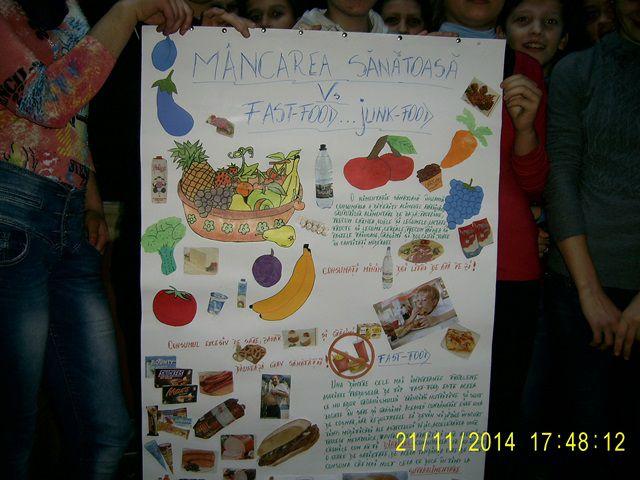 Elevii clasei a VII-a au realizat o planșă „MÂNCARE SĂNĂTOASĂ vs. FAST-FOOD... JUNK – FOOD” și au preparat o salată de fructe pe care au consumată împreună.