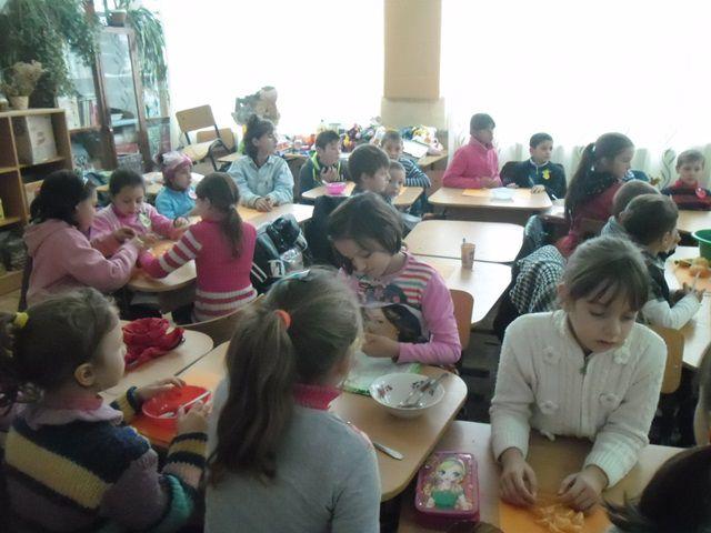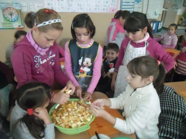 Elevii au învățat că o alimentație sănătoasă presupune și consumul de fructe. Îndrumați de doamnele învățătoare, elevii claselor mici au fost puși în postura de a pregăti o salată de fructe. Participarea activă și entuziasmul vârstei au condus la realizarea unui produs alimentar delicios.