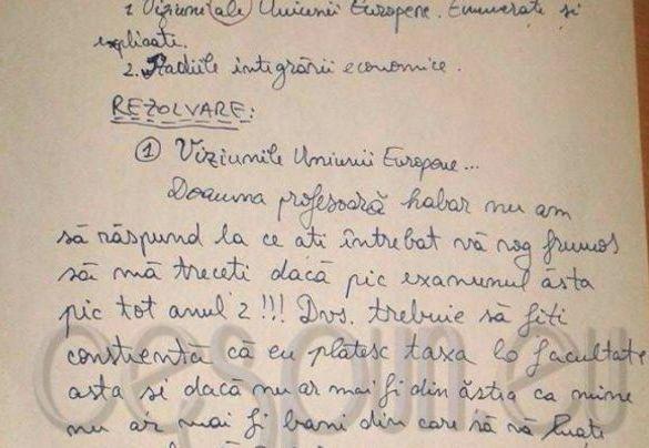 „Doamna profesoară habar nu am să răspund la ce aţi întrebat vă rog frumos să mă treceţi dacă pic examenul ăsta pic tot anul 2!!! Dvs. trebuie să fiţi conştientă că eu plătesc taxa la facultate asta şi dacă nu ar mai fi din ăştia ca mine nu ar mai fi bani din care să vă luaţi salariul. Vă rog din suflet!“