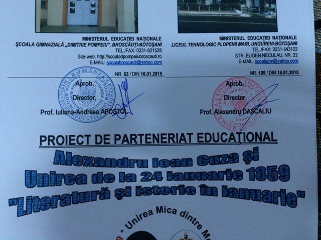 Sub acest titlu s-a desfăşurat un proiect de parteneriat educaţional în Şcoala Gimnazială „Dimitrie Pompeiu” Broscăuţi şi Liceul Tehnologic Plopenii Mari, comuna Ungureni cu ocazia sărbătoririi a 156 ani de la „Mica Unire” din 24 ianuarie 1859 înfăpuit de Alexandru Ioan Cuza.