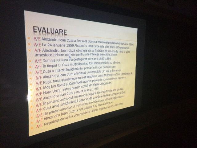 · „Alexandru Ioan Cuza – un dom legendar” – concurs adresat celor 50 de elevi implicaţi în proiect cu întrebări de tip Adevărat/Fals.