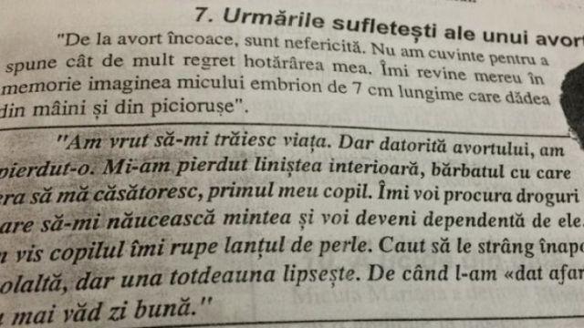 Liceenii află din manualele de religie că este un mare păcat să începi viaţa intimă înainte de căsătorie, iar avortul este un păcat capital. În manualul de religie de clasa a XII-a, adolescenţilor le este relatată întâmplarea unei tinere care a recurs la o întrerupere de sarcină, autorii insistând asupra „urmărilor sufleteşti". Autorii manualului încearcă să aibă impact asupra liceenilor şi cu o informaţii emoţionante: „Îmi revine mereu în memorie imaginea micului embrion de 7 cm lungime care dădea din mâini şi din picioruşe“.