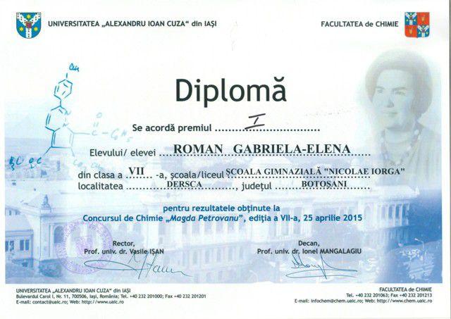 Astfel, eleva Roman Gabriela Elena, din clasa a VII-a, pregătită de prof. Babii Silvia, a obţinut premiul I – punctaj maxim – 100 puncte, la Concursul Naţional de Chimie „Magda Petrovanu” desfăşurat la Facultatea de Chimie a Universităţii „Alexandru Ioan Cuza” Iaşi – aprilie 2015.