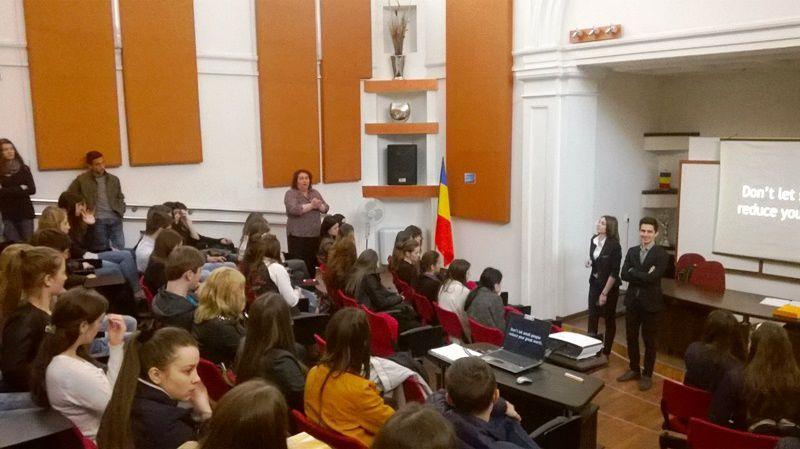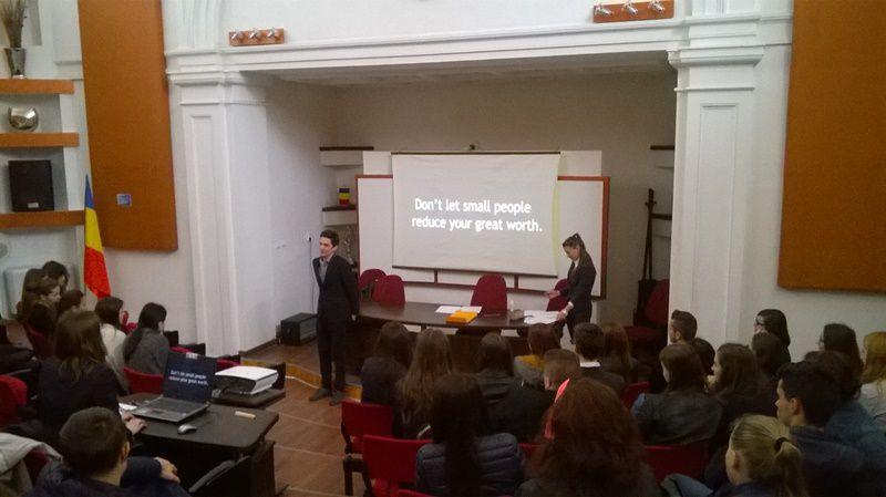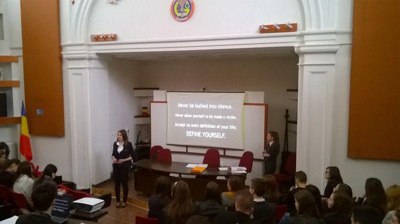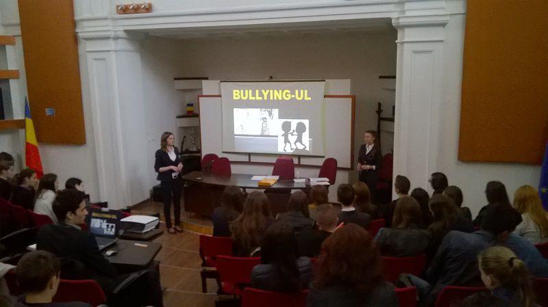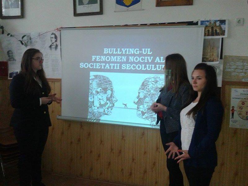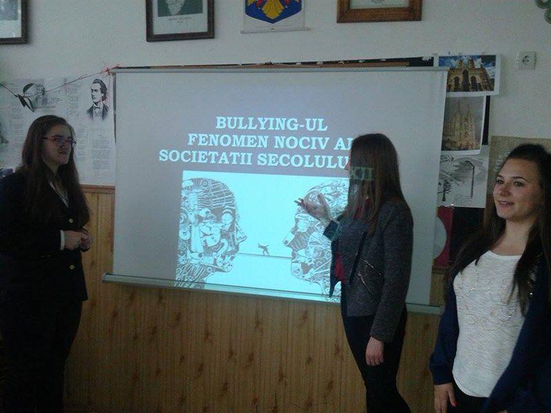 Prof. Baroi Lidia, prof. Pavel Daniela și consiler școlar Bucșă Cristina, alături de elevii Miron Adelina, Cucoreanu Teodora, Stredie Robert, Mihuță Miruna, Iuzic Georgiana și Dănilă Roxana, au prezentat materiale PPT și mai multe filmulețe pe baza cărora s-a discutat împreună cu cei prezenți în cele doua locații. S-au dat definiții, s-au prezentat cazuri reale, s-au identificat cauzele și formele de manifestare ale bullying-ului.
