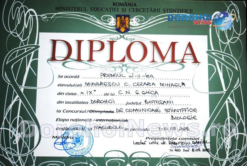 Juriul format din cadre universitare a apreciat cu premiul al II lea susţinerea convingătoare a lucrării „Cariotipul şi idiograma la Rana Ridibunda (Pall.1771), reuşita demonstrând încă o dată că la Colegiul Naţional „Grigore Ghica” Dorohoi, performanţa se descoperă şi încurajează.