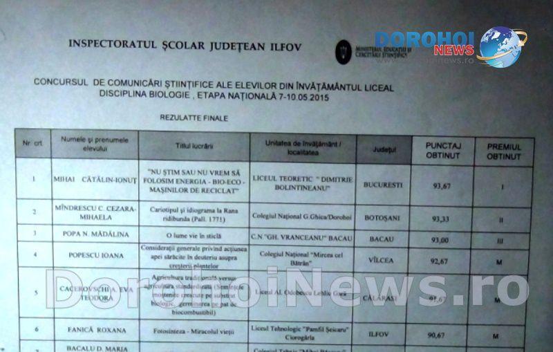 Etapa naţională a Sesiunii de comunicări ştiinţifice ale elevilor din învăţământul liceal la disciplina Biologie, organizată la Măgurele, jud. Ilfov şi-a desemnat câştigătorii. În urma susţinerii concursului de către elevii reprezentanţi ai judeţelor ţării, Botoşaniul a ocupat cu cinste poziţia a doua a podiumului.