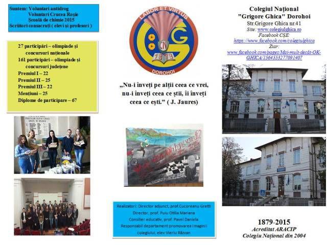 În săptămâna porților deschise 25 – 29 mai 2015, echipa de promovare a colegiului, formată din Consiliul școlar al elevilor și profesori, a vizitat școlile gimnaziale pentru a-și prezenta oferta educațională a anului școlar următor.