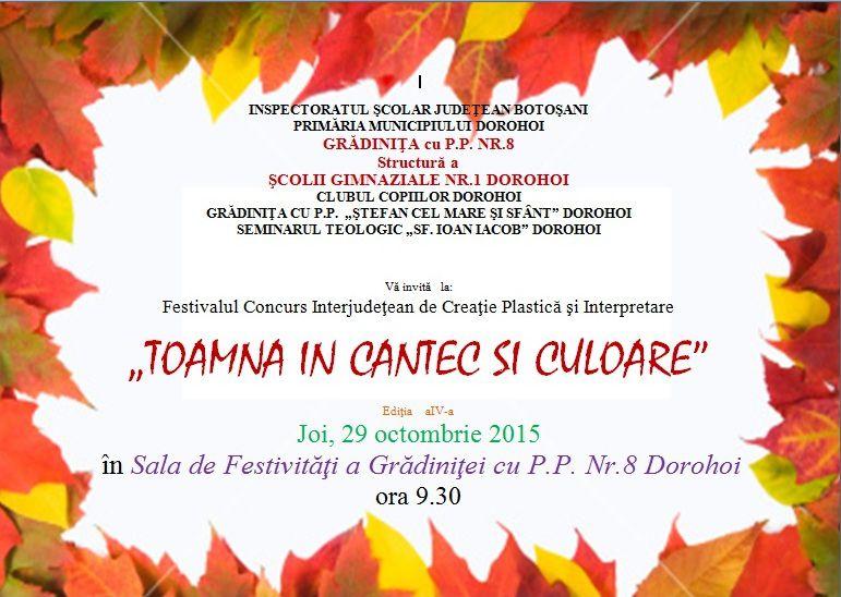 Grădiniţa cu P.P. Nr. 8 are onoarea de a vă invita să participaţi în data de 29 octombrie 2015, în Sala de festivităţi a unităţii, la cea de-a patra ediţie a Festivalului Concurs Interjudeţean „Toamna în cântec şi culoare”. Concursul se regăseşte în C.A.E.R. la poziţia 318.
