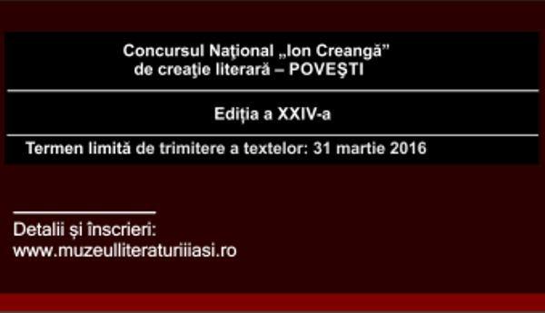 Muzeul Național al Literaturii Române Iaşi anunță startul înscrierilor pentru Concursul Naţional „Ion Creangă” de creaţie literară – POVEŞTI, ediția a XXIV-a. Ediția din anul 2016 se va desfășura în perioada 16-17 aprilie, la Muzeul „Ion Creangă” (Bojdeuca din Țicău).