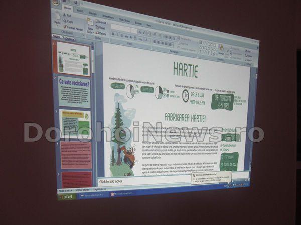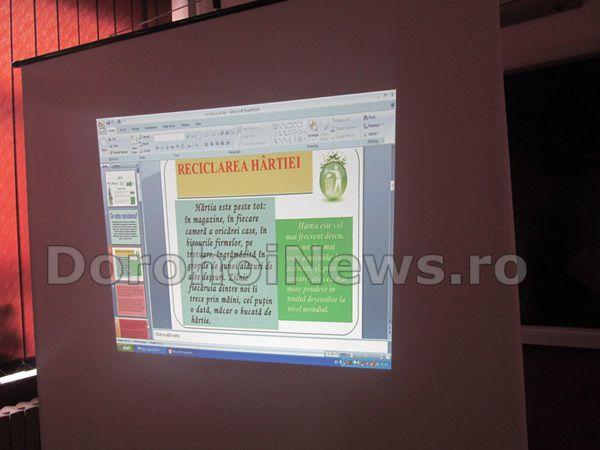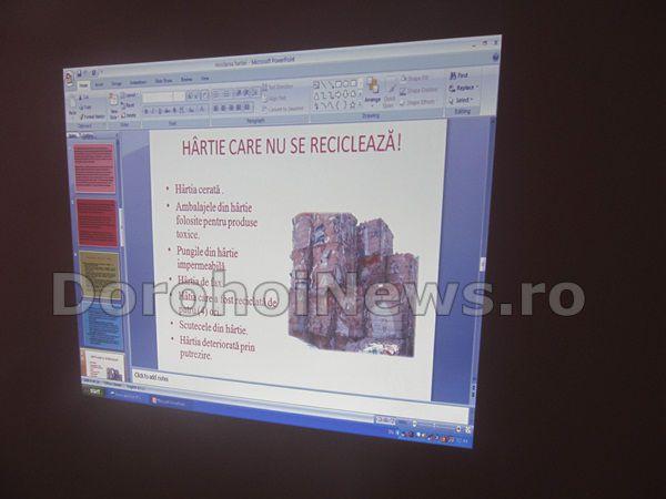 Activitatea de vineri, 4 martie a constat într-o prezentare power-point în care au fost prezentate: Importanta reciclarii hartiei,tehnologia reciclării hârtiei, celuloza, hârtia care nu se reciclează, sfaturile ecologiştilor cu privire la reciclarea hârtiei, relaţia hârtie-defrişare şi hârtie-poluare precum şi reglementări legislative.