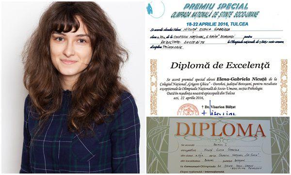 Succesul de la Olimpiada de Psihologie este precedat de un Premiu II obținut la etapa națională a aceluiași concurs în anul școlar trecut. De asemenea, în doi anic onsecutiv (2015 și 2016) a obținut Premiul II la etapa județeană a Olimpiadei de Limba Engleză. Iar intrarea, desigur cu succes, la Facultatea de Psihologie va încununa acest traseu.