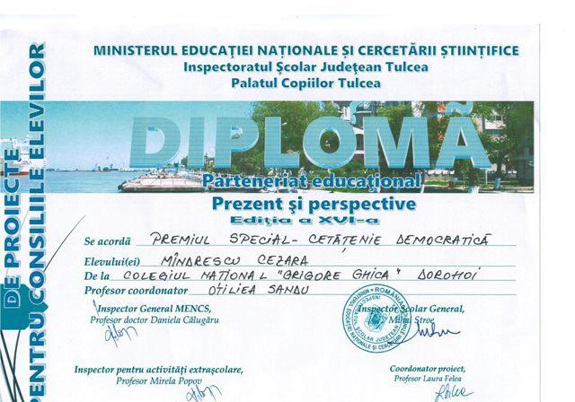 Proiectul prezentat de Cezara Mîndrescu, elevă a Colegiului Național „Grigore Ghica”, Dorohoi, denumit „Tineri pentru viitor 2.0”, a fost răsplătit cu Premiul special la categoria cu cei mai mulți participanți: Educație pentru cetățenie democratică.