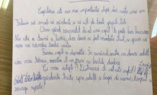 Profesorii de la Colegiul Național I. L Caragiale din București care supravegheat examenul elevilor de admitere în clasa a V-a au descoperit o ciornă scrisă de unul dintre candidați. Cuvintele copilului de 10 ani i-au impresionat pe dascăli până la lacrimi.