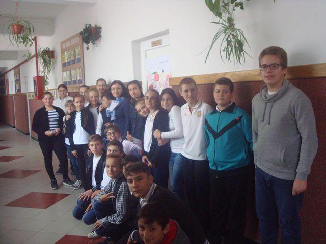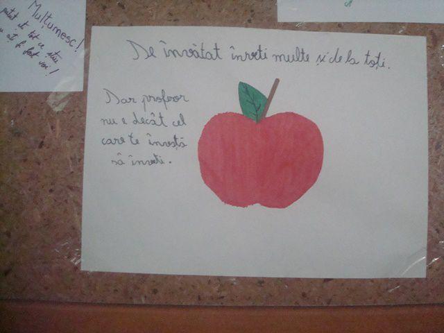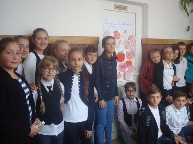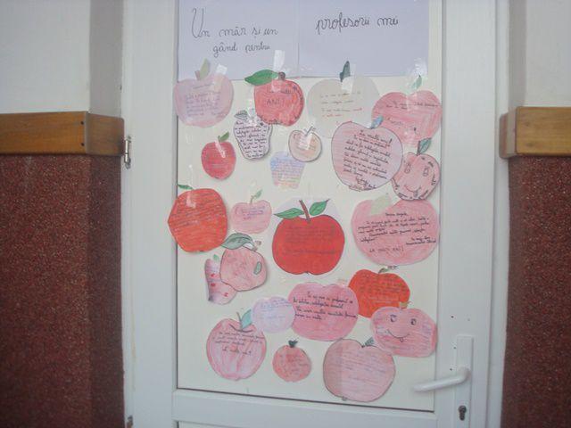 Elevilor din clasa a VI-a (prof. Predeanu Simona) şi a VIII-a (prof. Balinisteanu Anca, prof. Baciu Ana Maria) li s-a propus activitatea „Un gând şi un măr pentru profesorii mei”. Nu, nu a fost vorba de un măr adevărat, ci de un măr pe care fiecare dintre elevi trebuia să-l realizeze din hârtie și pe care să scrie  o idee, o urare, un cuvânt definitoriu pentru învățătorul, profesorul, dirigintele său. Așa se putea concretiza îndemnul acestei zilei de acum câţiva ani, „Take a Stand for Teachers!”, îndemn care rămâne valabil, deoarece educaţia de calitatese face prin colaborarea tuturor părţilor implicate. Elevii au fost inventivi și au demonstrat că știu să-i sprijine pe profesorii lor prin cuvinte frumoase. La final „merele” cu gânduri și idei interesante au poposit pe ușile sau pe pereţii claselor, să stea mărturie pentru ziua aceasta.