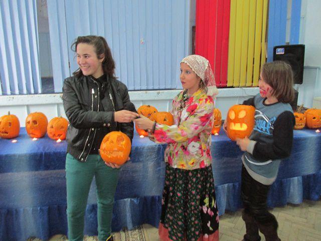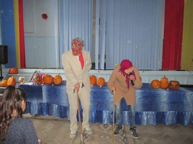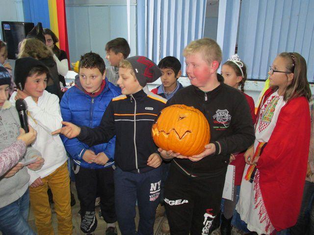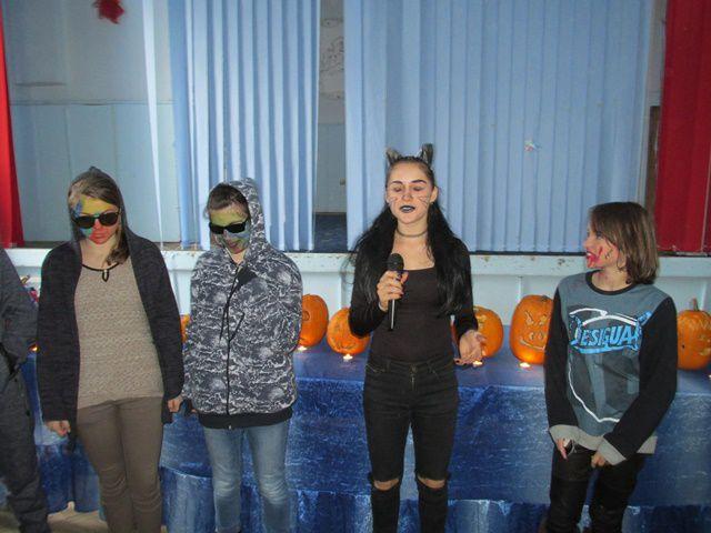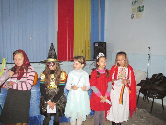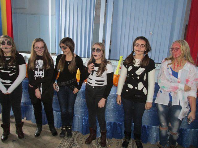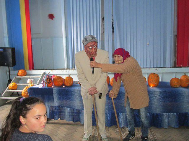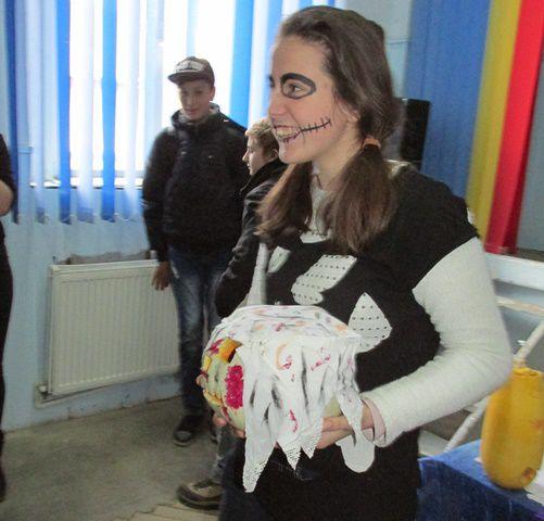 Desenele tematice, costumele si felinarele elevilor prezenti la activitate au creat un Halloween cu mască si fară mască in Sala de festivitati a Liceului Anastasie Bașotă din Pomîrla.