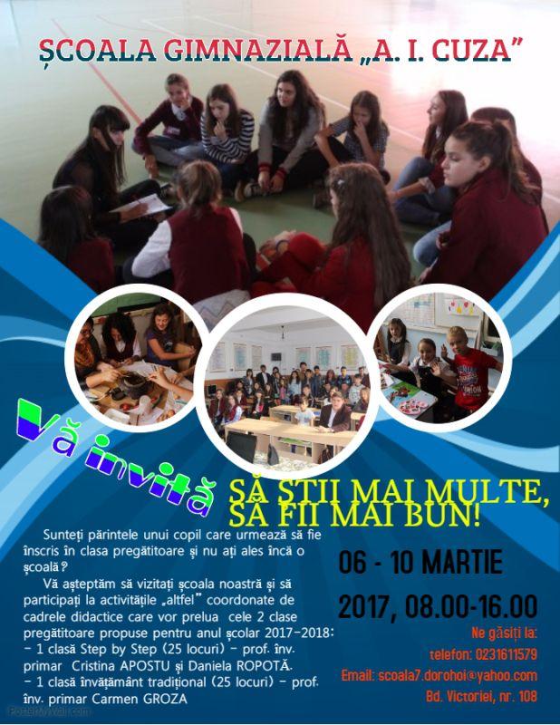 Vă așteptăm să vizitați școala noastră și să participați la activitățile „altfel” coordonate de cadrele didactice care vor prelua cele două clase pregătitoare propuse pentru anul școlar 2017-2018: