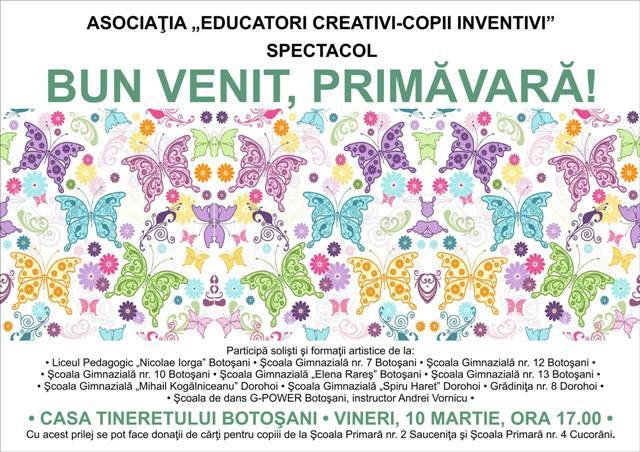 Astfel, Asociaţia „Educatori creativi – copii inventivi” din Botosani, asociaţie cu profil educaţional, a organizat spectacolul „Bun venit, primăvară!”, vineri, 10 martie, la Casa Tineretului Botoşani. Ideea acestui proiect aparţine prof. Florentina Dănilă, preşedinta Asociaţiei „Educatori creativi – copii inventivi”. În spectacol au evoluat 450 de copii din şcolile şi grădiniţele din Botoşani şi Dorohoi cuprinşi în grupuri vocale, formaţii de dansuri sau solişti vocali. Scopul spectacolului a fost acela de a oferi copiilor bucuria aplauzelor publicului, de a avea şansa de a evolua pe o scenă, nu în competiție, ci din plăcere. În acelaşi timp s-a făcut o colectă de carte școlară pentru grădiniță și clasele primare, care va fi completată cu cărți cumpărate de asociație din fondurile colectate prin vânzarea biletelor.